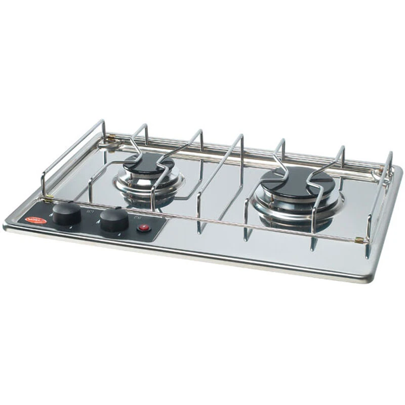 This flush-mount, built-in cooktop features two burners in a compact design, yet provides real cooking power with its strong Btu heat output. High-quality, polished stainless-steel construction with thermocouple gas shut off and electronic ignition for onboard safety.