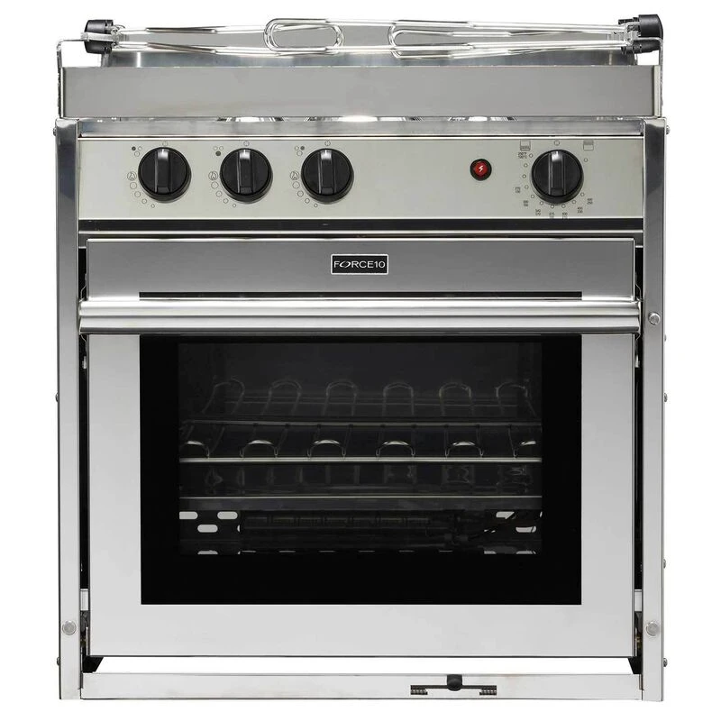 Force 10 ranges provide completely safe cooking at sea, with a minimum of maintenance. Standard infrared broilers produce great sandwiches and broiled fish. Force 10’s unique, patented slide-away oven door maximizes galley space while maintaining true gimbal balance-whether the door is open or closed. It locks securely in position when closed, but slides beneath the oven when open. All units include mounting hardware.