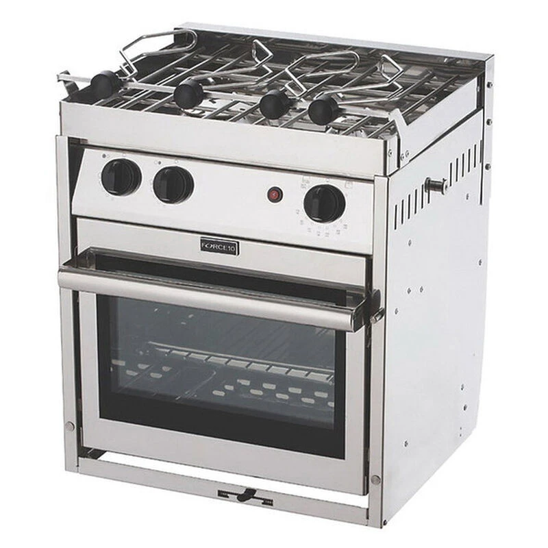 Force 10 ranges provide completely safe cooking at sea, with a minimum of maintenance. Standard infrared broilers produce great sandwiches and broiled fish. Force 10’s unique, patented slide-away oven door maximizes galley space while maintaining true gimbal balance-whether the door is open or closed. It locks securely in position when closed, but slides beneath the oven when open. All units include mounting hardware. The tilt-top grill raises for easy cleaning. Safety thermocouples at each burner stop the flow of propane seconds after the flame is extinguished. Each range is designed to accommodate a 3/8″ female flare swivel. Includes two sets of pot holders. Trim kits for converting Models 1987338, 1988039, 1988096 and 1988146 to built-in installation sold separately.