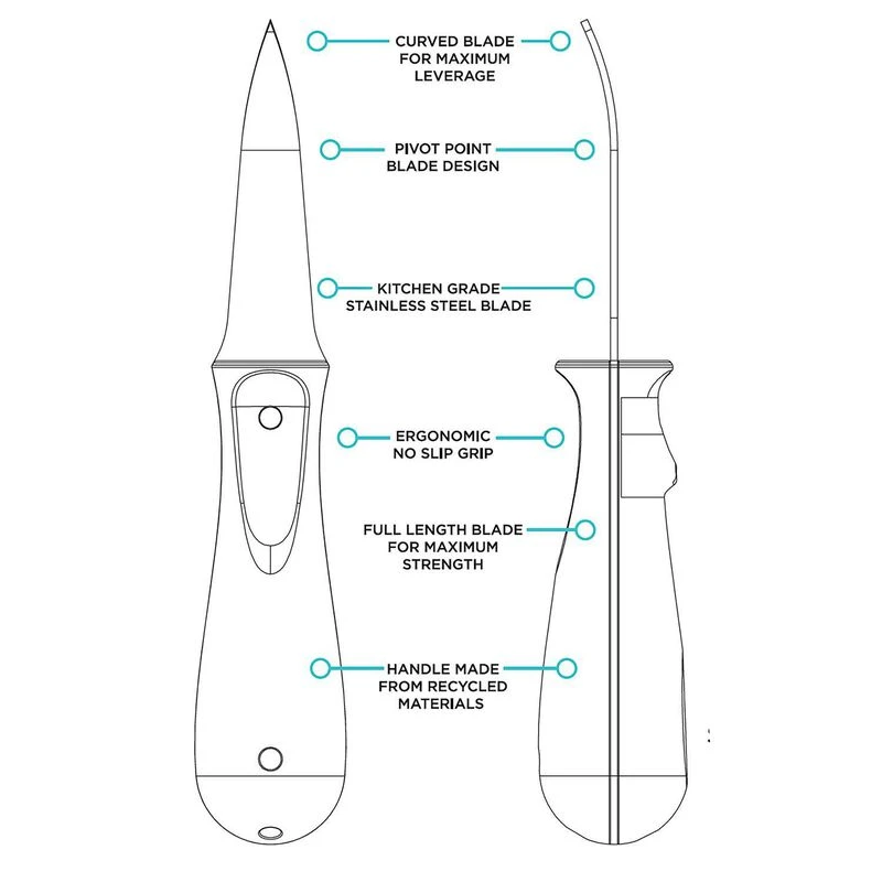 - Ergonomic thumb print handle design eliminates hand slippage making shucking safer